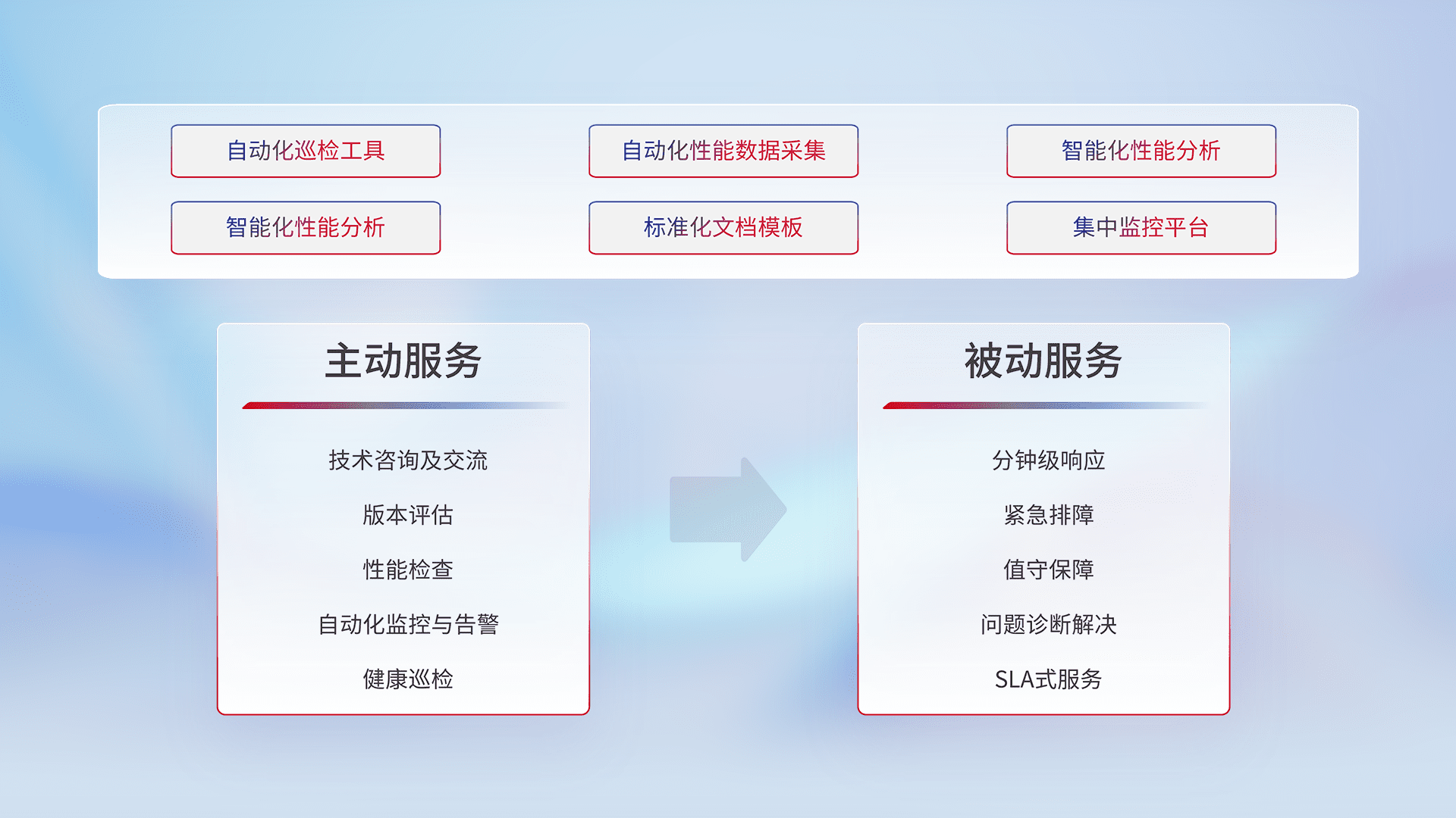 智能化工具和标准化文档,,保障服务质量,,提供主动服务(包含技术咨询、、版本评估、、、、性能检查、、、自动化监控与告警、、、健康巡检)和被动服务包含(分钟级响应、、、、紧急排障、、、、值守保障、、问题诊断解决、、、SLA服务)。。。。